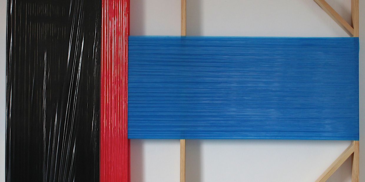 Plastic wrap on wooden stretcher bars. 57.5 x 37.4 Inches.