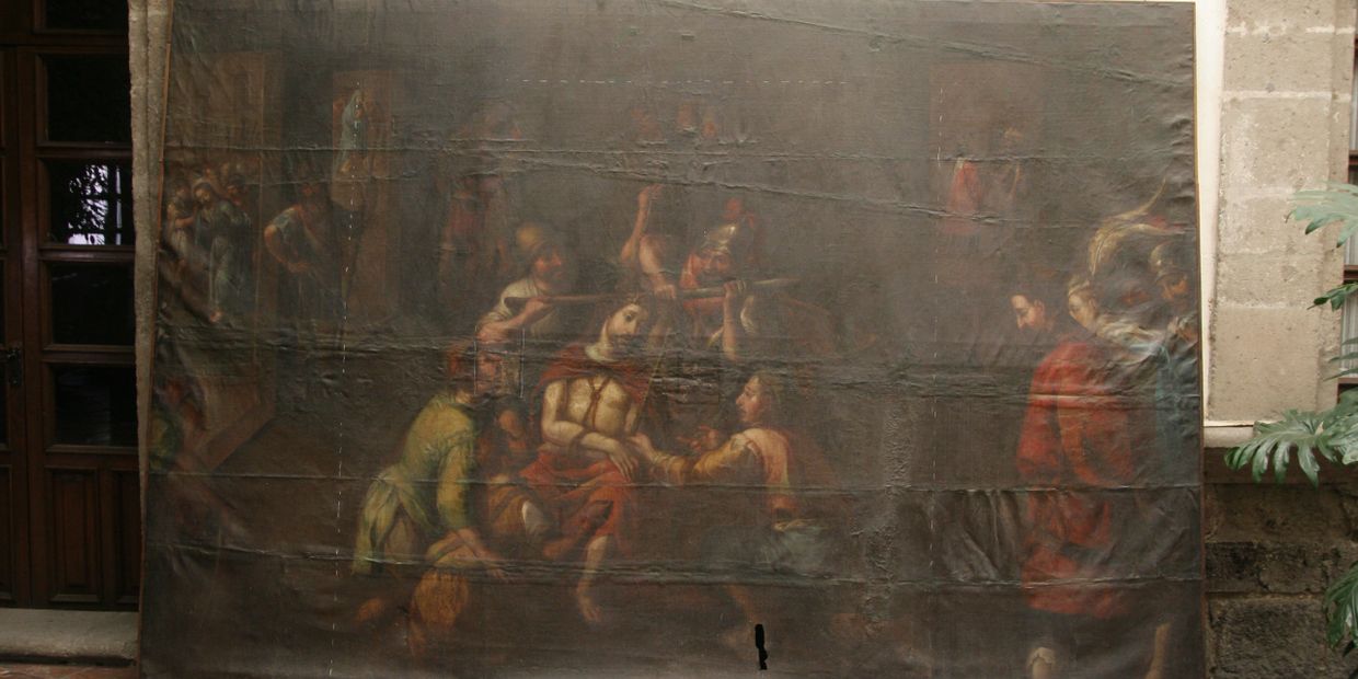 Lienzo del siglo XVIII usado para ser intervenido con plástico burbuja y posteriormente con pintura vinílica "color piel".