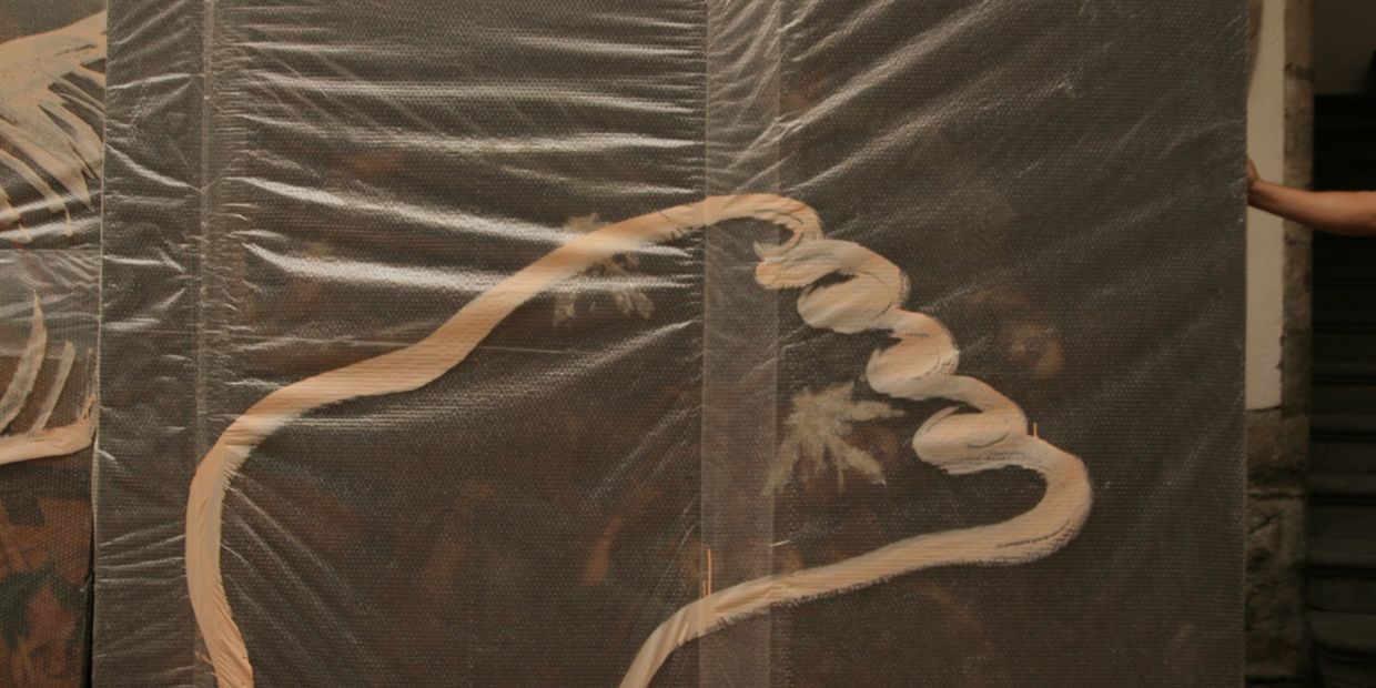Sin titulo. Pintura vinílica sobre plástico burbuja sobre pintura colonial.